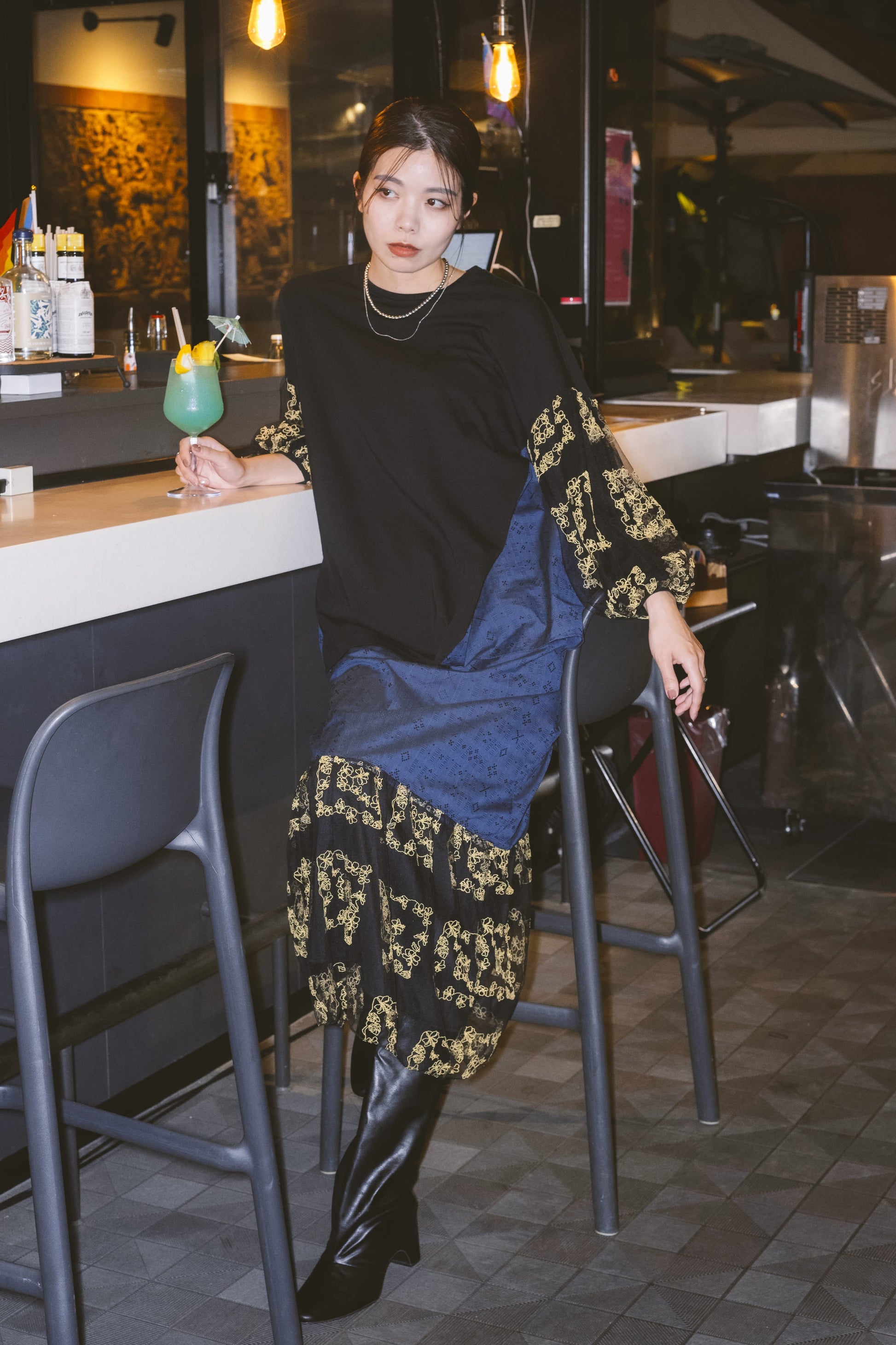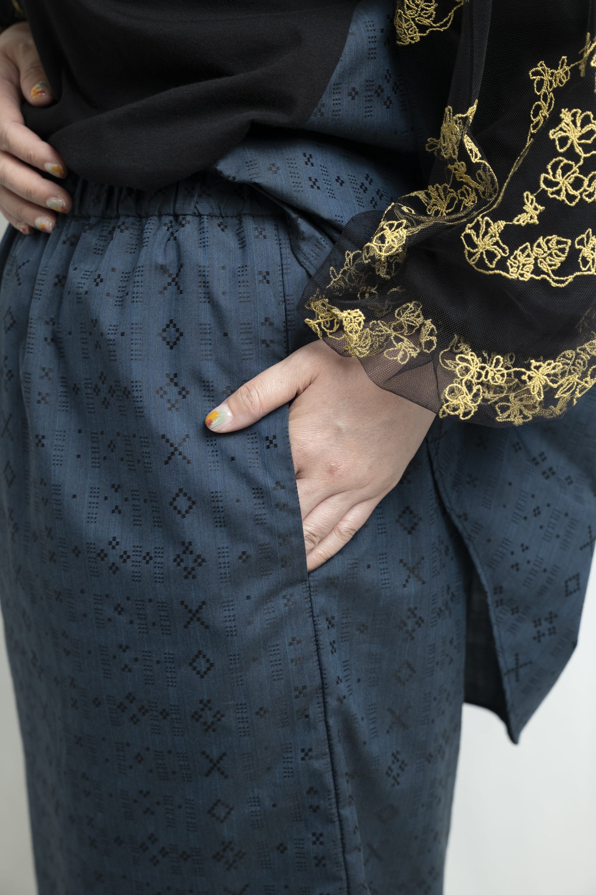繊細に織り込まれたミンサー柄と、チュール刺繍の異素材使いのスカート。